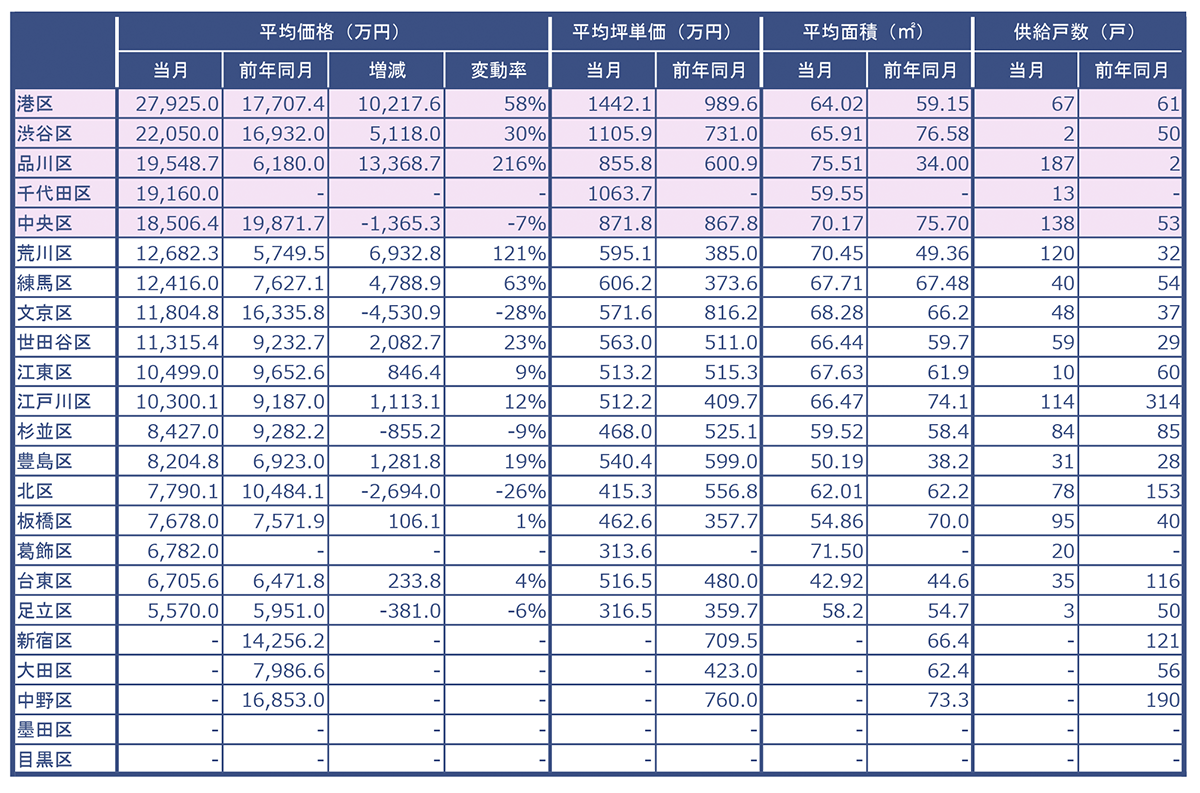 東京23区の各行政区毎に、平均価格、平均坪単価、平均面積、供給戸数をまとめました。当月の平均価格が大きい順に表示しています。