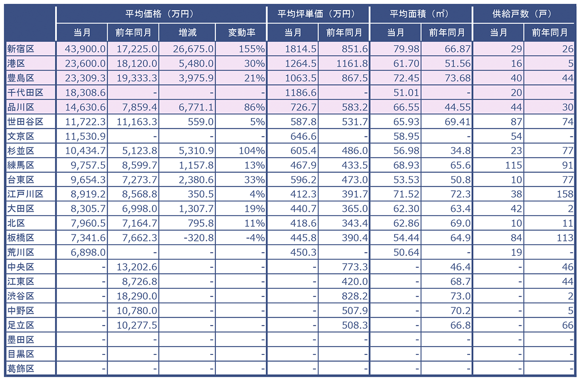 東京23区の各行政区毎に、平均価格、平均坪単価、平均面積、供給戸数をまとめました。当月の平均価格が大きい順に表示しています。