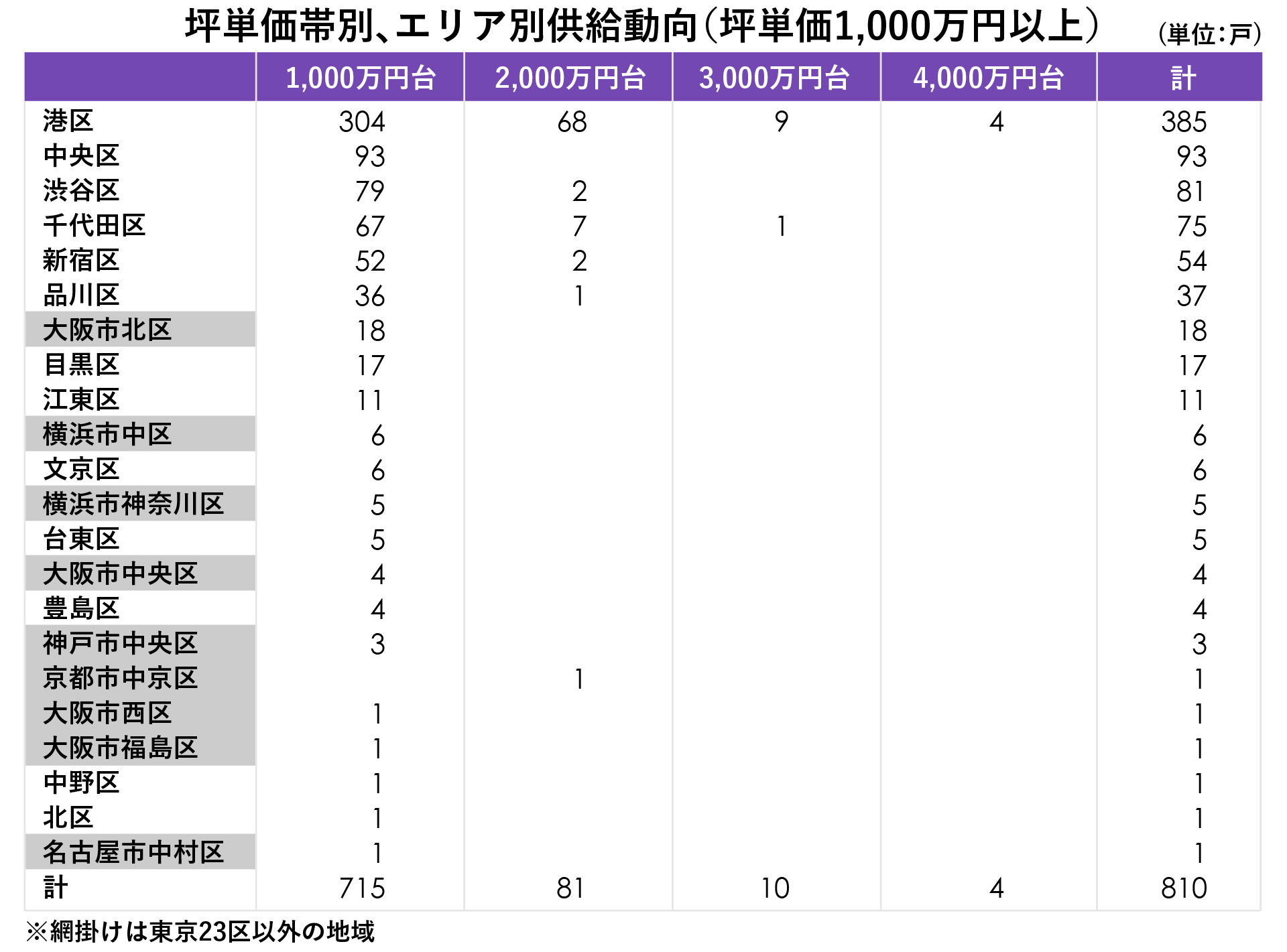 2025年に流通した中古マンションを調査したところ、坪単価1,000万円(1㎡あたり約300万円)以上の住戸は22の行政区で計810戸ありました。