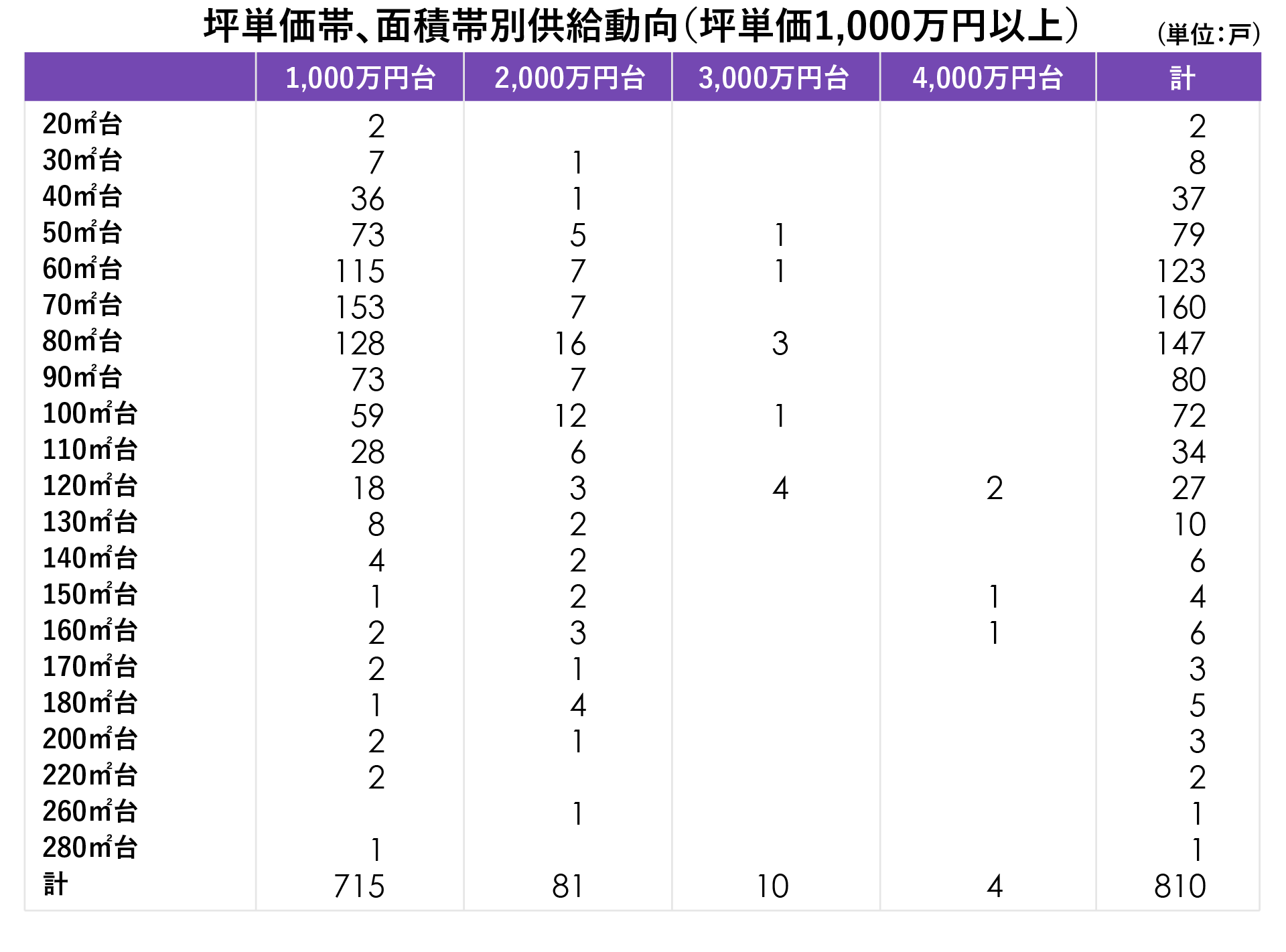 面積帯別に見ると、20㎡台のコンパクト住戸から200㎡以上の広面積プランまで幅広いプランで坪単価1,000万円を超える坪単価で供給されていることが分かります。