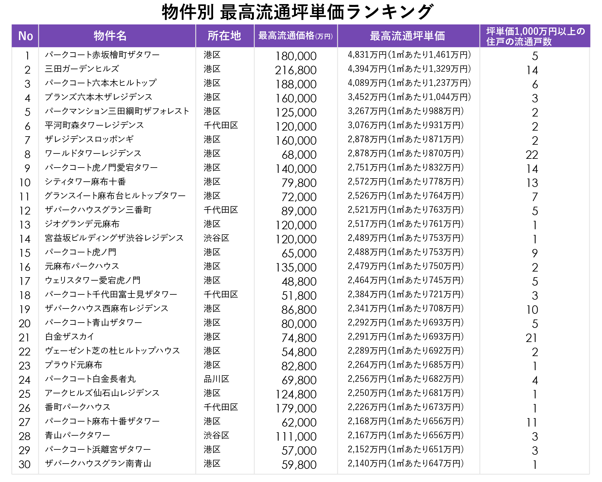 住戸別の最高流通坪単価ランキング上位30物件の中で、最高流通価格が10億円を超える物件が全体の半数弱となる14物件もありました。