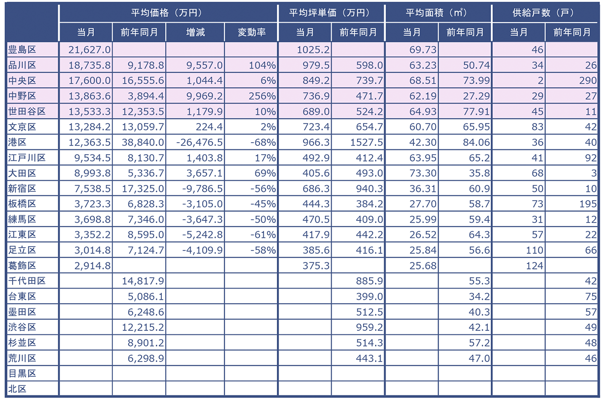 東京23区の各行政区毎に、平均価格、平均坪単価、平均面積、供給戸数をまとめました。当月の平均価格が大きい順に表示しています。