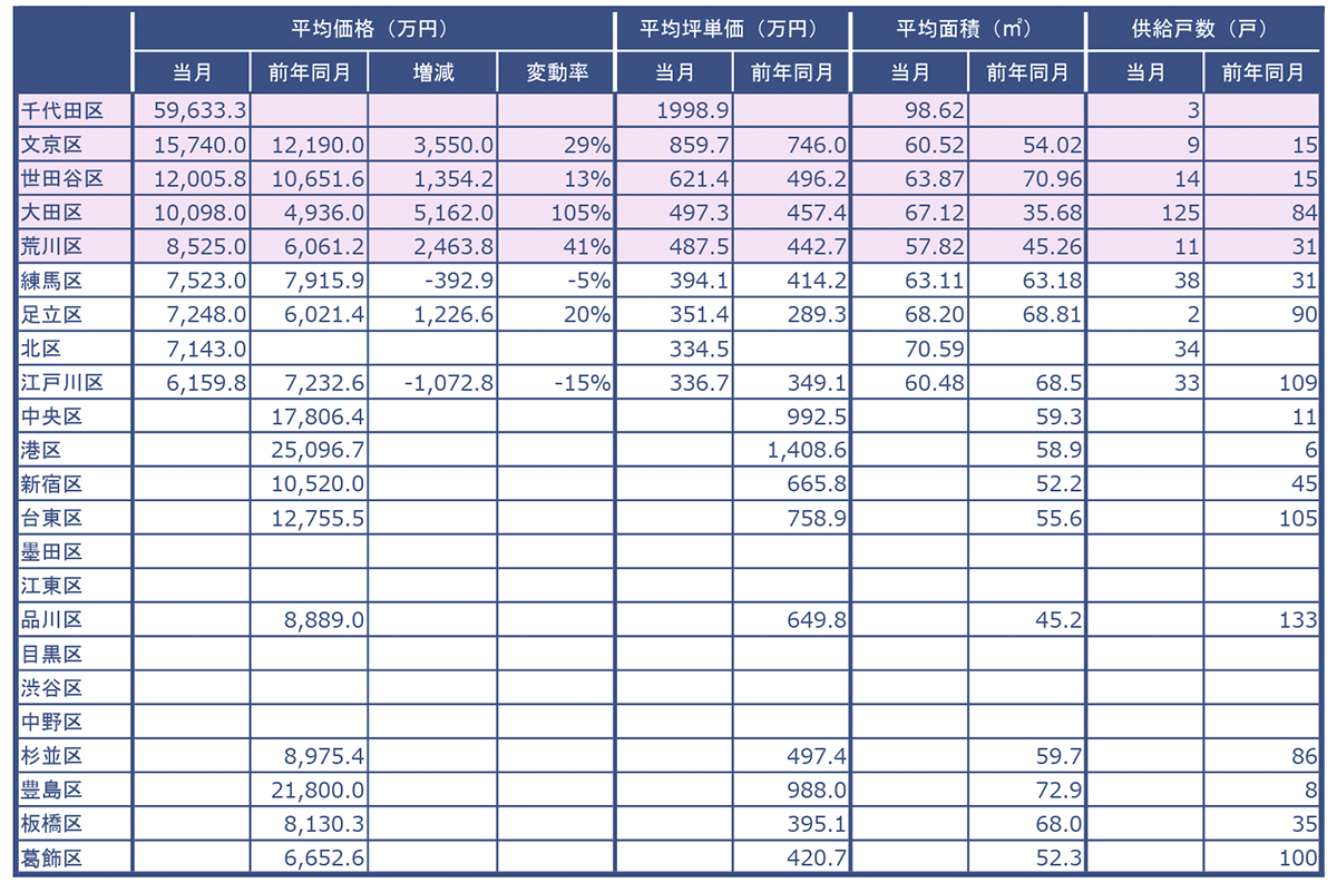 東京23区の各行政区毎に、平均価格、平均坪単価、平均面積、供給戸数をまとめました。当月の平均価格が大きい順に表示しています。